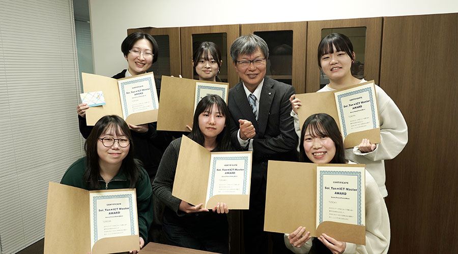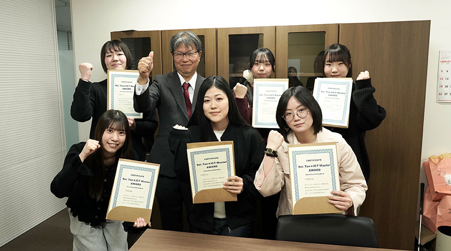 短期大学部の「ICT活用演習」と「プレゼンテーション」の授業期間中、MOS(Microsoft Office Specialist)の各種資格取得試験において、Excel・PowerPoint・Wordの3科目に合格した学生12名が「2025年度Sei-Tan Award」を受賞し、表彰状と副賞を受け取りました。