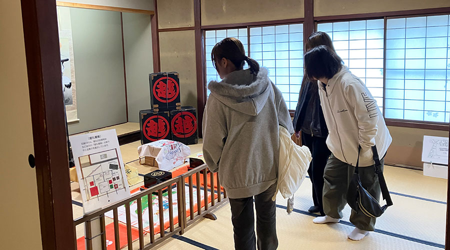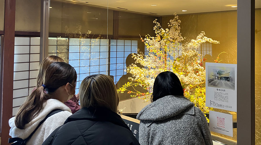 「金澤老舗百年展」や「加賀花てまり作品展」など、魅力的な資料を目にすることができました。特に、本物の花や鳥に見えるお菓子でできた「花神輿」には皆の目が釘付けになっていましたね。百年を超えて市民に親しまれてきた「老舗」の建物から、創業の精神を感じ取ることができたでしょうか?