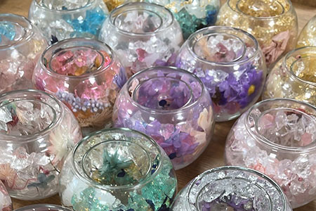 この写真は昨年12月に「Sei-Tan Act!」の活動でのジェルキャンドルを作った時の写真です。金箔やドライフラワーなどの素材を好みに合わせて自由に詰め込んでオリジナルのキャンドルを完成させることができ、作っていてとても楽しかったです。今も玄関に飾っています♪