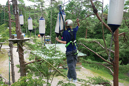 この写真は、今年の夏にSei-Tan Act!の活動でウッドアドベンチャーを体験している時の写真です。地上8mの高さにあるアスレチックを攻略していく体験だったのですが、先に進むと後には戻れず本当に怖かったです。