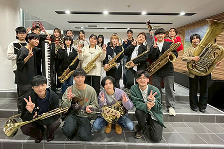 この写真は、昨年の流星祭のときに吹奏楽部のみんなと撮影したものです。編入学試験の1週間後が本番という忙しい時期でしたが、仲間の支えもあり、当日は吹奏楽部の仲間と楽しんで演奏することができ、大きな達成感を味わいました。吹奏楽部だけでなく、オープンキャンパス活性化プロジェクトや学友会など、複数の居場所があったおかげで学生生活をより充実させることができました。編入後も吹奏楽を続けていきたいと思っています!