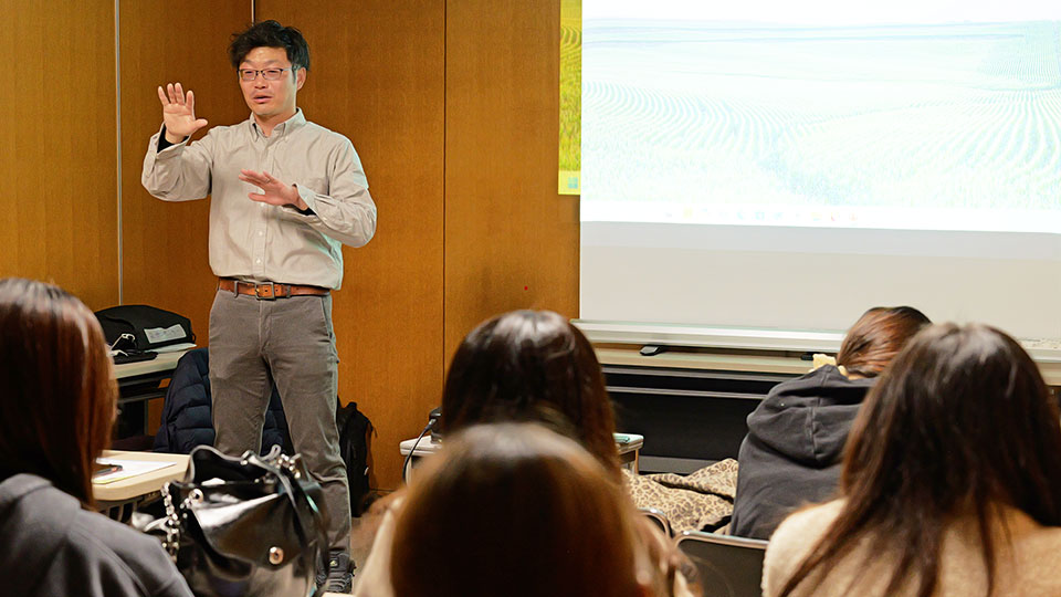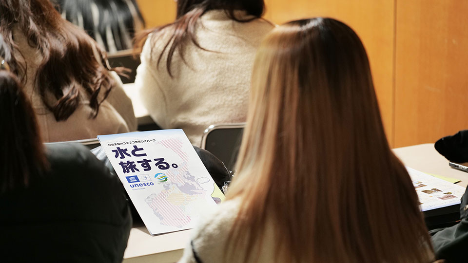 白山市には現在、平野部(特に市街地)に人口が集中し、特に山間部の過疎が進行しているという課題もあります。日比野さんは、都市型の大規模開発ではなく、エリア全体で自然と共生する「地域振興」の実現に向け、地域に住む一人ひとりが「地元には何もない」という意識を変え、「理解を深める」努力を継続していく市と協議会の方向性について、力強く語りました。白山市ならではの自然環境と世界的な価値評価、それを守るための取り組みについて学んだゼミ生は今後、農業や農産物を軸とした魅力発信の在り方を考えていきます。