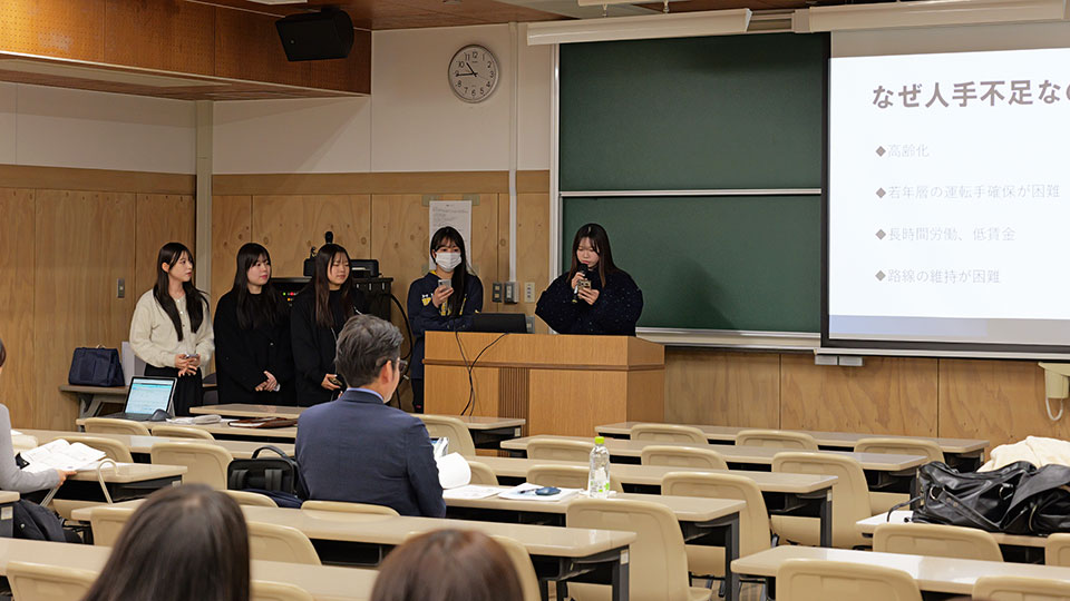 9/23(火)の顔合わせおよび11/25(火)の中間報告会に続き、今回の個別報告会にも同社専務取締役の木下恒喜さんにお越しいただきました。木下専務は野林ゼミナールに対し、「バス運転手の確保に向けた打ち手」と「企業として地域のためにできること」という2つの課題について若者ならではのアイデアを求めており、今回の発表は中間報告会と同じく「バス運転手の確保に向けた打ち手」に取り組む2つの班から始まりました。