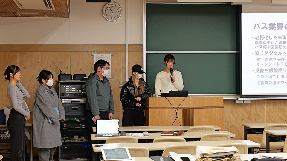 2班目は、バス業界の現状として、車両やインフラの老朽化も人材確保に影響しているといった調査結果に触れ、まずはバス運転手として働く4つのメリットと6つのデメリットを紹介しました。そこから『株式会社丸一観光』が既に導入している対策とその成果を紹介し、他社の事例も見ながら導き出し対策を示しました。木下専務は、ゼミ生の視点の鋭さを称賛し、実施している取り組みへの手応えを再確認した様子でした。