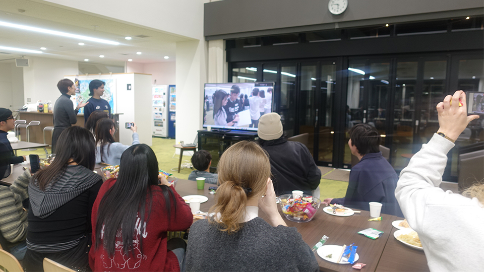 本学での学生生活を終える留学生10名を送別するため、グローバルコモンズ2Fにてフェアウェルパーティーを開催しました!星稜アンバサダーズが企画したフルーツバスケットゲーム、食事をしながらの交流等を通して、留学生は本学で参加する最後のイベントを楽しんでいる様子でした。これまでのイベントで撮り溜めた写真をつないだムービーを上映すると、歓声を上げながら思い出に浸っていました。上映後は留学生一人ひとりからコメントをもらい、「ここで出会った仲間は一生の宝物」といった言葉に、喜びや感謝、別れの寂しさが溢れていました。