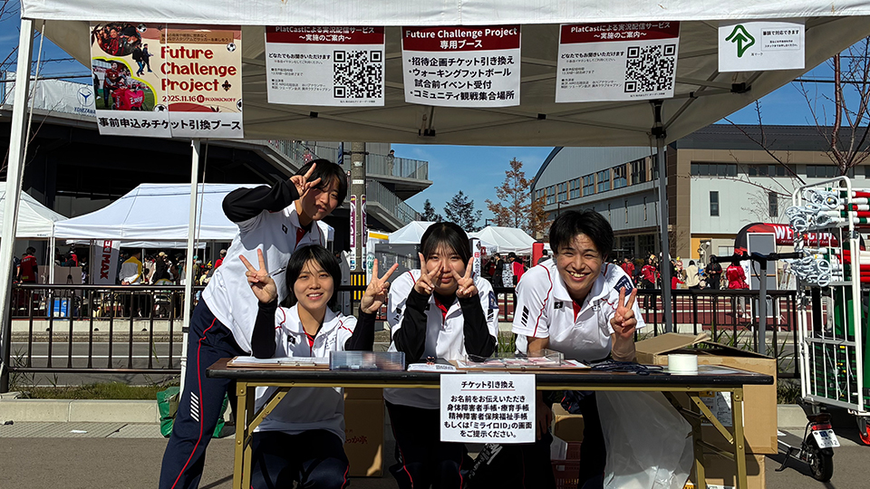 スポーツ学科西村ゼミナール・新谷ゼミナールの学生が、ツエーゲン金沢の本拠地・金沢ゴーゴーカレースタジアムで開催された「Future Challenge Project 2025」に参加し、社会的課題である「共生社会」の実現に向けた実践的な取り組みを行いました。