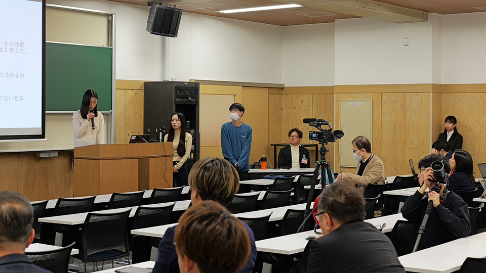 これまでゼミナール単位での個別報告会は実施されてきましたが、5ゼミナールが発表内容を共有するのは今回が初めて。会場にはパートナー企業の関係者のほか、『石川県中小企業家同友会』の会員である他の企業関係者も駆けつけ、それぞれの成果を見届けました。