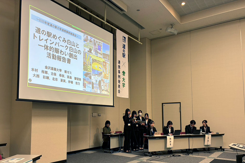 経済学部新ゼミナールに所属する3年次の学生6名が、「産学官連携で地域課題解決へ」をテーマに東京都内砂防会館で開催された「令和7年度 道の駅×大学連携事例発表会」(主催 国土交通省)に参加しました。当日の発表大学は本学を含め10大学で、新ゼミナールの学生たちは「道の駅めぐみ白山とトレインパーク白山の一体的賑わい創出」のタイトルで発表を行いました。