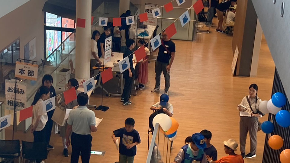 事前に開催されたこども会議に出席して「どのようなまちをつくりたいか」を一緒に考えたり、まちにつくるお店の看板づくりを手伝ってきた学生たち。当日はイベントの準備や片付けを行いながらこどもたちを見守り、職業体験をサポートしたり、疑似通貨で買い物をする消費者体験を一緒に楽しみました。