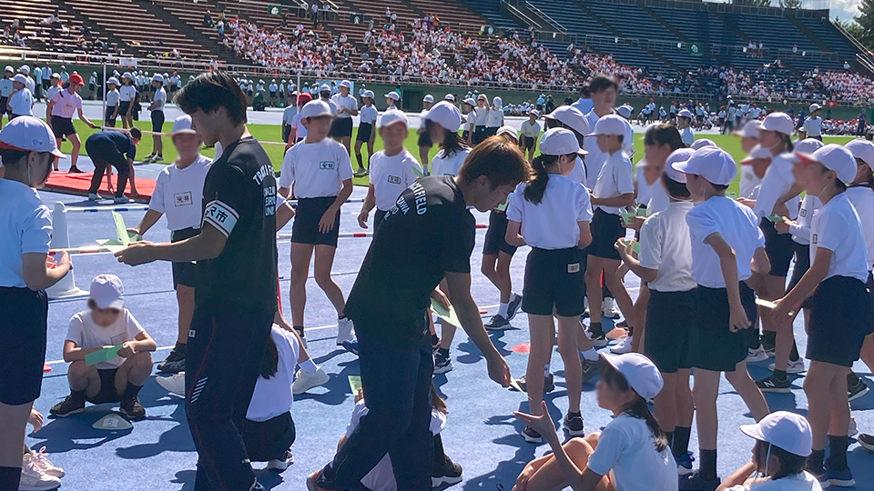 今回で連合体育大会のサポートとして参加は2回目でした。1回目の時からエキシビジョンで100mとリレーを小学生の前で走らせていただきました。そのときは子どもたちと触れ合うことができなかったため、今回は自分から小学生と触れ合うことを目標として活動に挑みました。