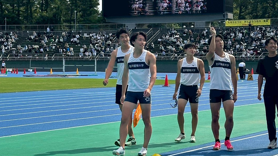 西部緑地公園陸上競技場で行われた連合体育大会に、本学の陸上競技部が参加しました。連合体育大会は金沢市の小学校および教育委員会が主体となって開催する金沢市小学校6年生が約4000人参加する大会です。陸上競技部は、部員が小学生へ100m走、ハードル走、ソフトボール投、リレーを見せるエキシビションと、短距離走や記録証の受け渡し、片付けなどの運営サポートをしました。
