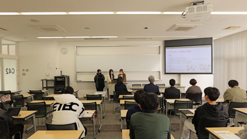 ゼミ内で分かれた各グループが順番に、限られた持ち時間で行う発表のターンでは、「継続性」と「スキル向上」という企業側の要望を踏まえ、流行や季節性を捉えたオリジナル商品の生産業務やデスクワークの委託業務など、バラエティに富んだ案を次々と提示していきます。中には障がいの程度や種類に応じた役割分担など、仕組みづくり、コスト面にまで踏み込んだ企画もありました。