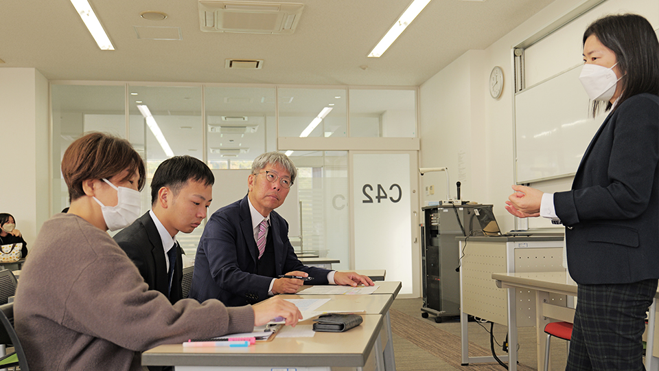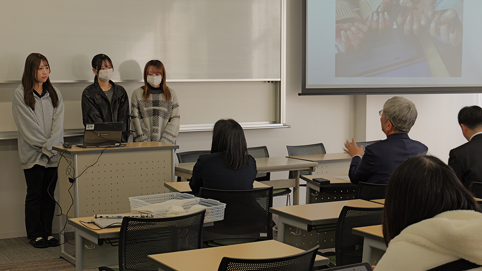 この日は『ケービーエフ株式会社』代表の東克也さんと部署長の中島椎也さん、そして同社が2025年より新事業として運営する『self-A・HOPE泉』で管理者を務めている上田茂美さんの3名が、企業側のゲストとして本学を訪れました。