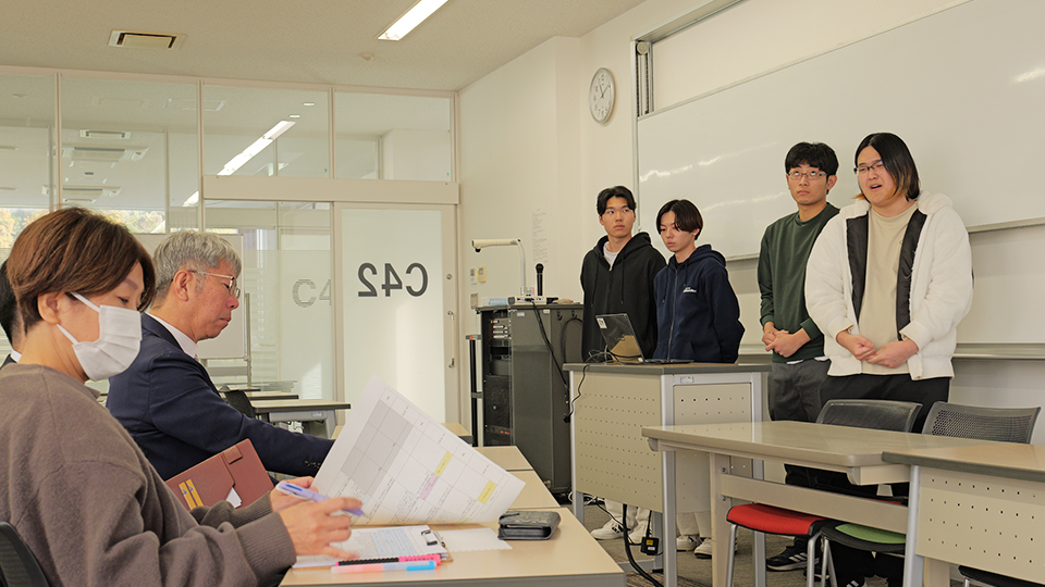 一つひとつの発表にじっくりと聞き入る東社長らは、若者ならではの視点や切り口に関心を寄せながら、素朴な疑問から具体的な方法について質問を重ねていきます。もちろん、経営のプロとしてコスト面や市場での独自性や優位性など、シビアな視点からの掘り下げも行いました。