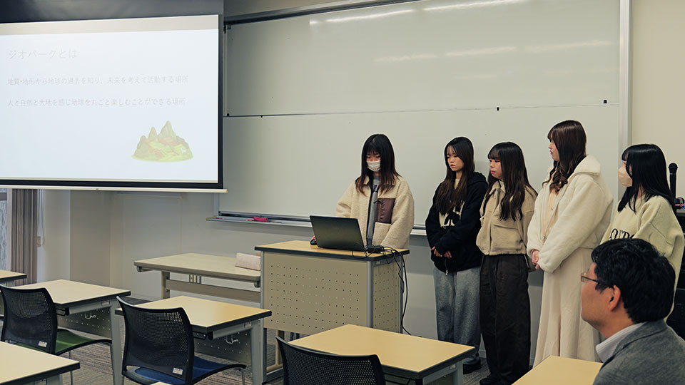 舘さんは、自社を含む地域の農業を活性化させるには、白山市の農産物(有機農産物)の魅力を的確に伝える必要があり、そのためには白山市が推している「白山手取川ジオパーク」や「ジオ教育」、「オーガニックビレッジ宣言」について正しく周知する必要があると考えています。その発信方法について柔軟なアイデアを求めている舘さんに対し、ゼミ生は独自に調べてパワーポイントにまとめた「ジオパーク」自体の概念と目的、そして「白山手取川ジオパーク」の取り組みと課題についての調査(下調べ)結果を披露しました。