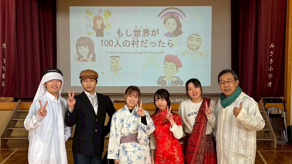 11/17(月)に石川県珠洲市のみさき小学校を訪問した学生たちは、1~6年生を対象に「もし世界が100人の村だったら」というワークショップを行いました。このワークショップは、参加者にさまざまな国や言語、年齢などが書かれたカードを配り、その役になりきって他者とコミュニケーションをとってもらう活動です。このワークショップを通して、日本と世界の言語の違いや多様性、生活環境、英語を学ぶ意味を考える時間を作りました。