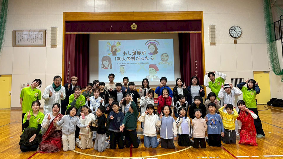 みさき小学校で「もし世界が40人の村だったら」のワークショップを実施し、英語を学ぶ意味や世界の多様性について考えてもらうため、低学年にも理解しやすい言葉やふりがな付きのスライドを活用しました。児童たちは話を聞く姿勢と活動の切り替えがとても上手で、私たちも楽しく進められました。
