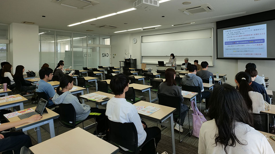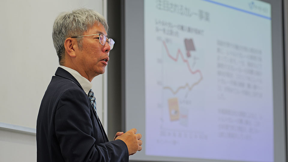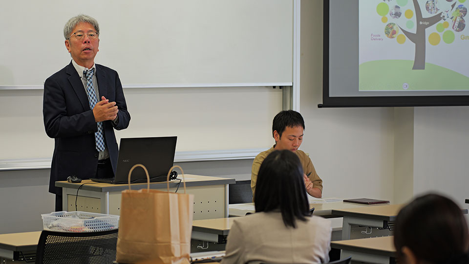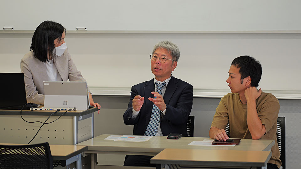 第1回の取り組みでは、同社代表取締役の東克也さんと部署長の中島椎也さんがゲストとして訪れ、土屋准教授がゼミ生に「企業活動」や「共創インターンシップ」の根本的な仕組みや目的などを共有した後、自社の概要や歴史、事業の現在地と未来に向けた課題や展望について説明しました。