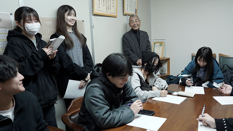 ボイラー室の見学後は事務所内で意見交換を実施。松永さんは「『若い世代にもっと銭湯の魅力を伝えられたら』と館内を整えたりSNSの工夫もしているが、まだまだ前へ進みたい。銭湯は高齢者の見守りや安全確保の観点でも役に立っている。みなさんの若者視点のアイデアと、経営者目線の提案を期待している」と改めて協力を要請。「銭湯文化の理解促進や交流の場の創出について私たちからアイデアが提供できれば」という神﨑教授の言葉を皮切りに、学生たちから松永さんに向けてさまざまな質問が寄せられ、活発な議論が行われました。