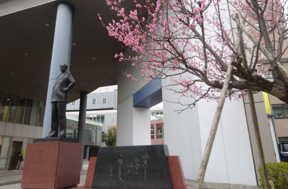 筆写撮影「金沢星稜大学正面の初代理事長碑と満開の梅」