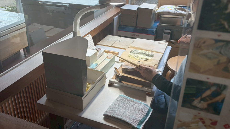 工房では、金箔が完成するまでの工程について説明を受けるとともに、実際の作業の様子を見学し、繊細な技術によって仕上げられていく過程を間近で学びました。また、金箔の貼り付け体験にも参加し、わずかな力加減で破れてしまうほど薄い素材を扱う難しさや、作業に求められる集中力と丁寧さを実感しました。