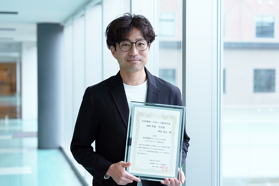 人間科学部スポーツ学科の西村貴之教授が筆頭著者の論文「総合型地域スポーツクラブにおけるクラブマネジャーの世代交代」が、日本体育・スポーツ経営学会の令和7年度「学会賞」を受賞しました。